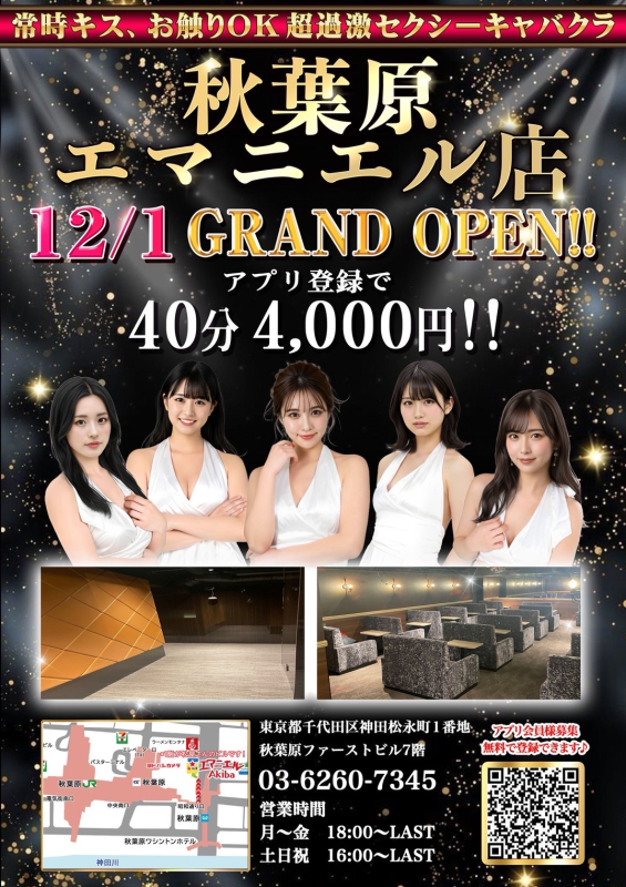 SO-1グループが遂に!秋葉原に進出!!!!2025年12月3日秋葉原エマニエル店グランドオープン♪HP限定割引!!超ハイクラス美女、未経験、素人を中心に70名~在籍中☆秋葉原の “ 常時DEEPキス&お触りOK” のセクキャバがHP限定最安価格オールタイムOK!フリーのお客様こちらの画面ご提示で・・・1set40分4,000円(税・サ込み)&生ビール・ハイボール・レモンサワー・焼酎・ソフトドリンクなどなど無料飲み放題!にて、ご案内致します♪さらにアプリ会員登録をして頂いたお客様には!超絶お得な+10分サービス50分4,000円&生ビール・サワー類・焼酎・ソフトドリンクなどなど無料飲み放題!にて、ご案内致します♪【アプリ登録方法】https://itunes.apple.com/jp/app/id6752919046 ↑↑↑↑↑↑アップルストアからご登録の方はこちらをクリックしてください♪https://play.google.com/store/apps/details?id=jp.apv. emaakiba ↑↑↑↑↑↑グーグルプレイからご登録の方はこちらをクリックしてください!ダウンロードしましたら生年月日・ニックネームを入力して頂き、画面下【登録】ボタンを押すと、登録完了となります!!女の子のプライベートブログや、入店情報などなど、、最新情報が満載です♪エマニエル秋葉原店は常時おさわり・パイ揉み・パイ舐め・キスし放題!
